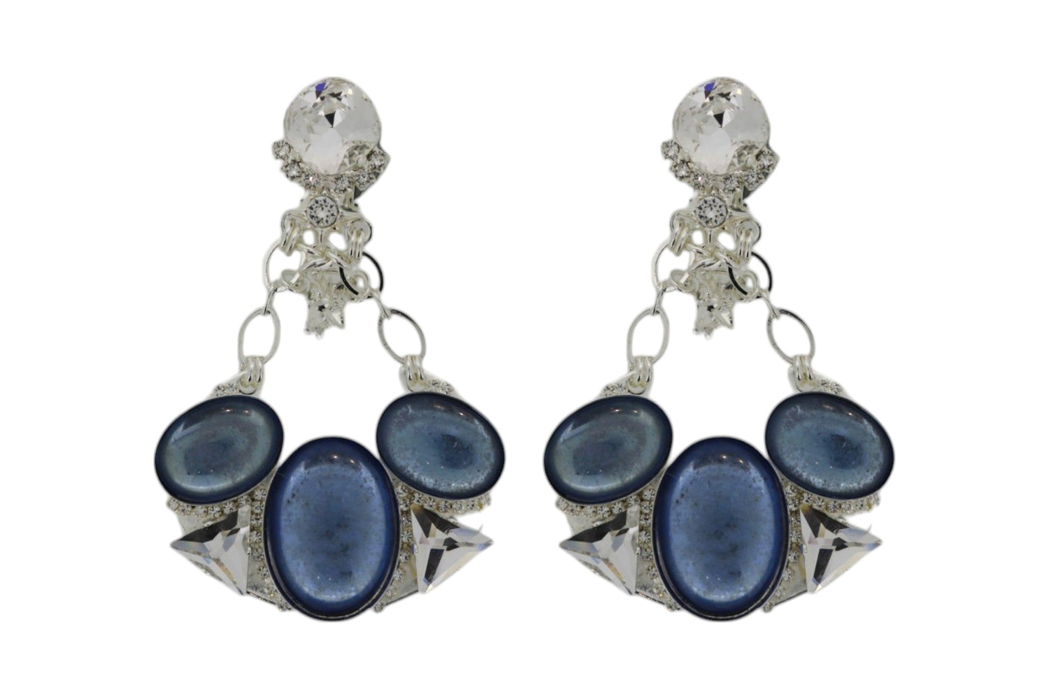 The Luminescent Earrings are a bold yet refined pair of chandelier earrings. These crescent-shaped earrings are made with sterling silver plating and showcase a graceful arc adorned with luminous blue cabochons and delicate, clear crystals. They capture the mystique of moonlit skies, adding celestial elegance to your look.