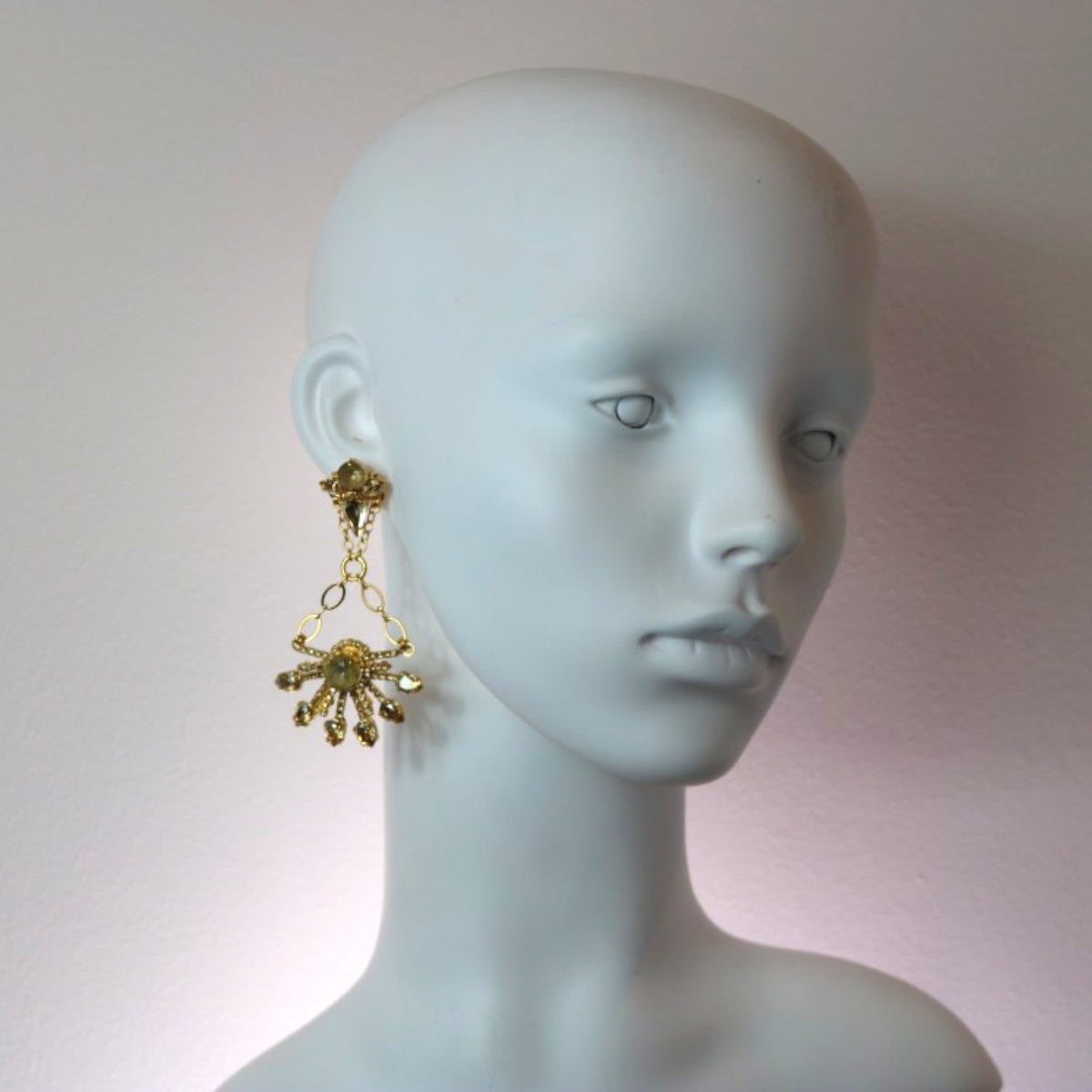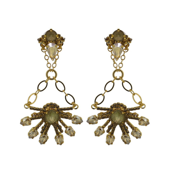 The Champagne Burst Chandelier Earrings exude festive elegance. Crafted in 23k gold-plated brass, each earring features a dazzling starburst motif of Premium Austrian crystals that are intricately hand-finished and suspended from delicate chains. They are a celebration of artisanal craftsmanship and timeless glamour.