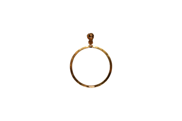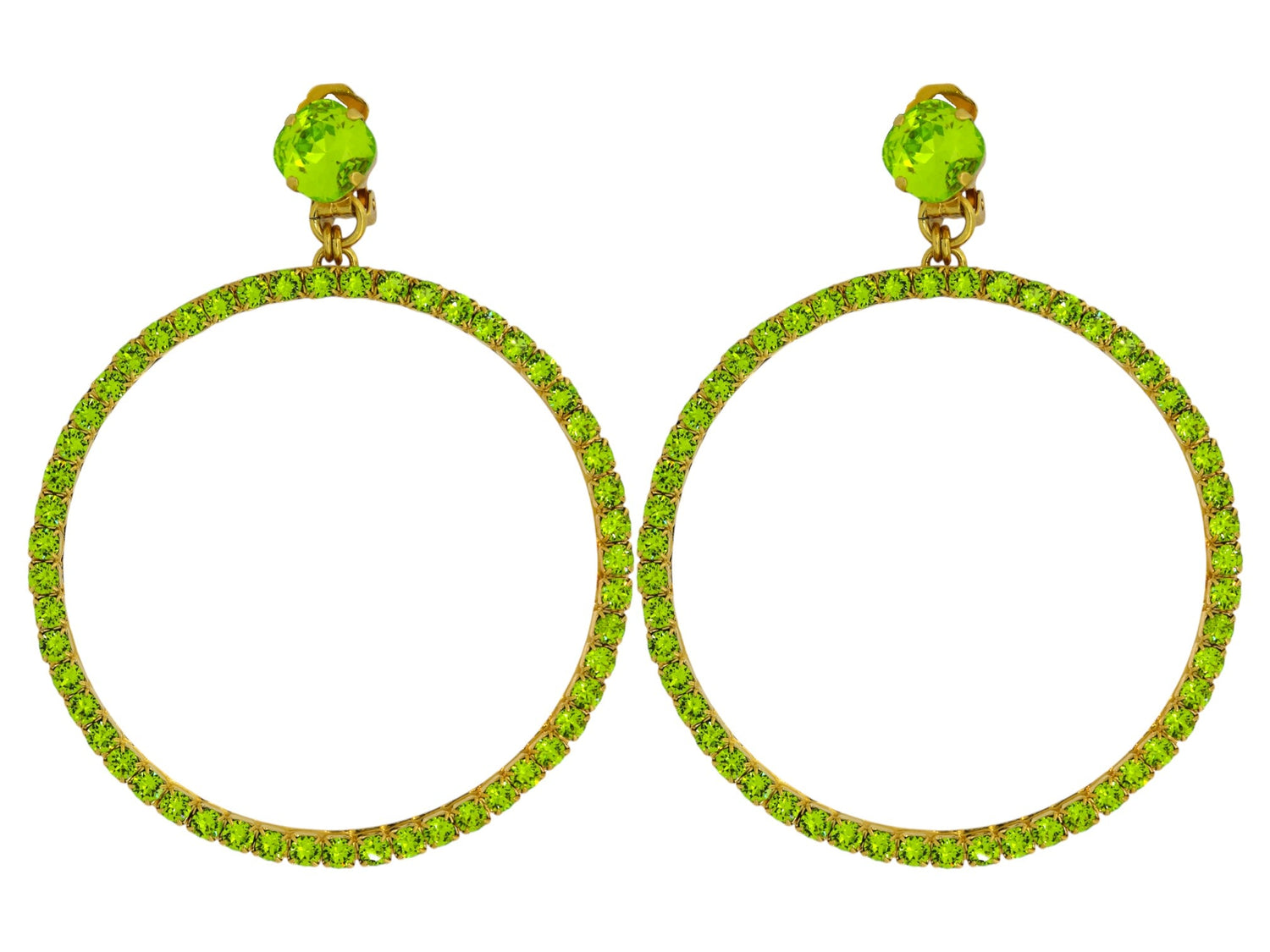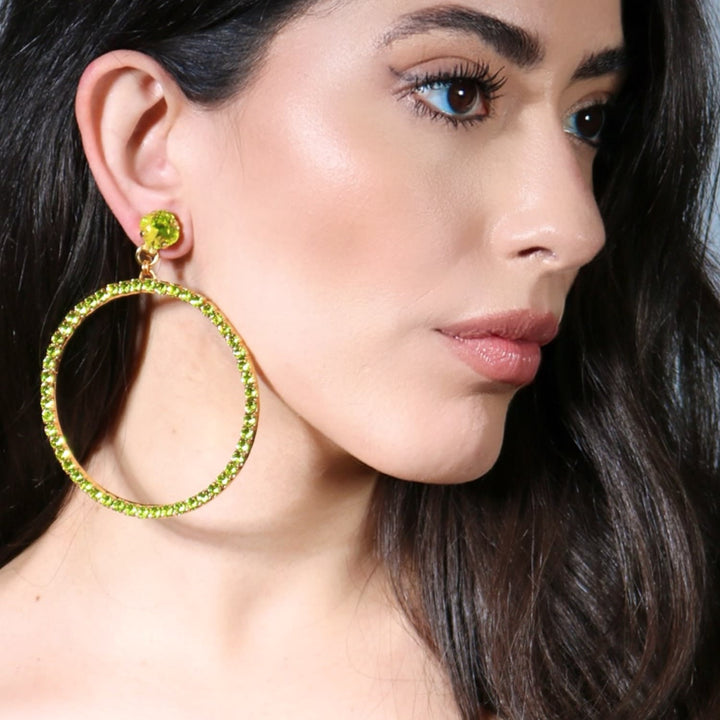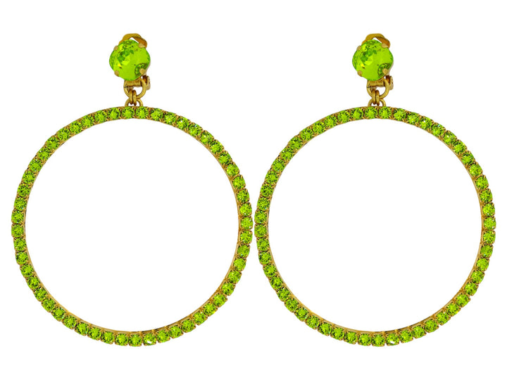 These Large Green Hoop Earrings by Vickisarge are a scene-stealing essential inspired by Studio 54. These clip-on hoops are set with 52 premium Austrian crystals in a luxurious 23k gold plating. They are handcrafted to add a touch of drama to any look, and despite their size, they are lightweight and comfortable for extended wear.