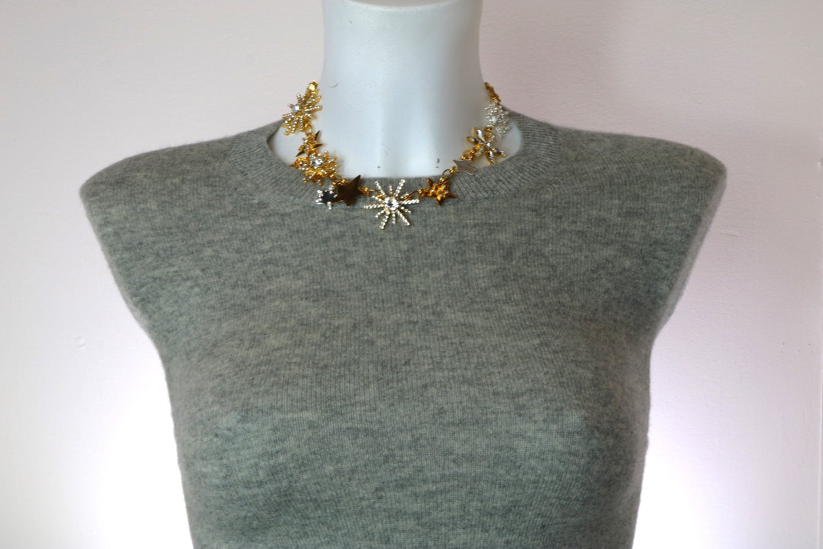 The Aurora Necklace by Vickisarge is a captivating and elegant piece. It features a dynamic arrangement of starburst patterns crafted in a mix of 23k gold and sterling silver-plated tones. Each starburst is adorned with sparkling Premium Austrian crystals, adding a celestial touch and a radiant look to any outfit. The necklace's blend of warm and cool metals creates a versatile and sophisticated design.