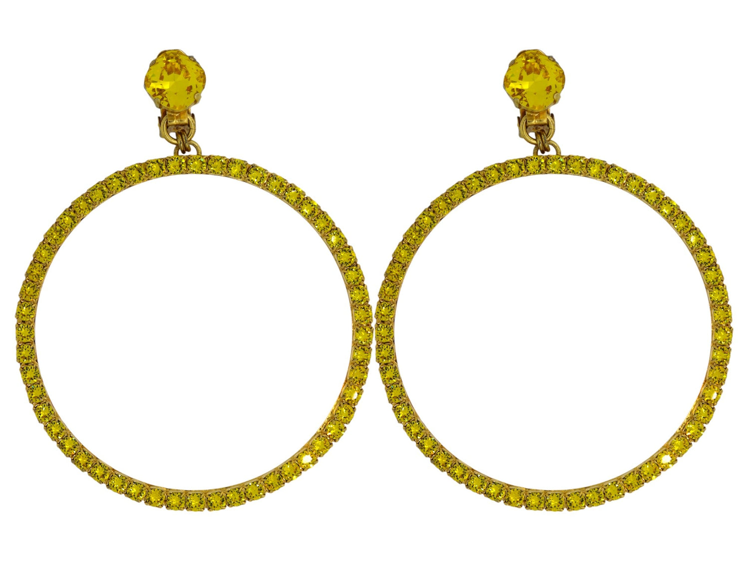 These Large Yellow Hoop Earrings by Vickisarge are a scene-stealing essential inspired by Studio 54. These clip-on hoops are set with 52 premium Austrian crystals in a luxurious 23k gold plating. They are handcrafted to add a touch of drama to any look, and despite their size, they are lightweight and comfortable for extended wear.