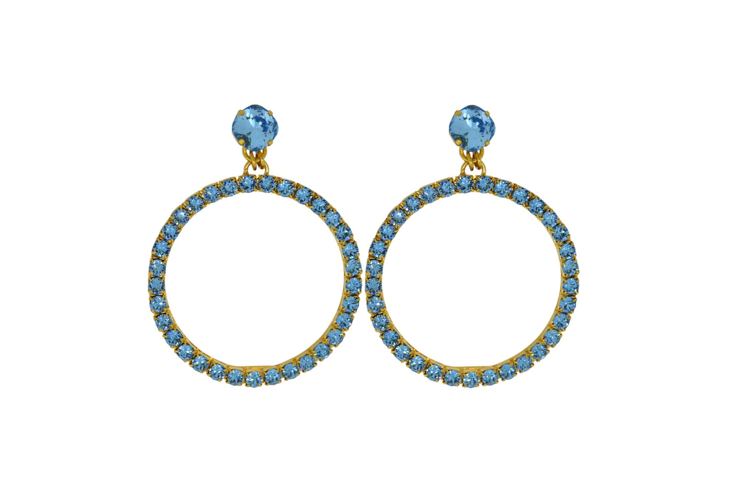 These Medium Blue Hoop Earrings by Vickisarge are a dazzling tribute to Studio 54's legendary style. Set with 33 premium Austrian crystals in a luxurious 23k gold plating, these hoops are designed to make every moment a celebration. The vibrant blue stones create a bold and confident statement, perfect for adding a touch of drama and elegance to any look.
