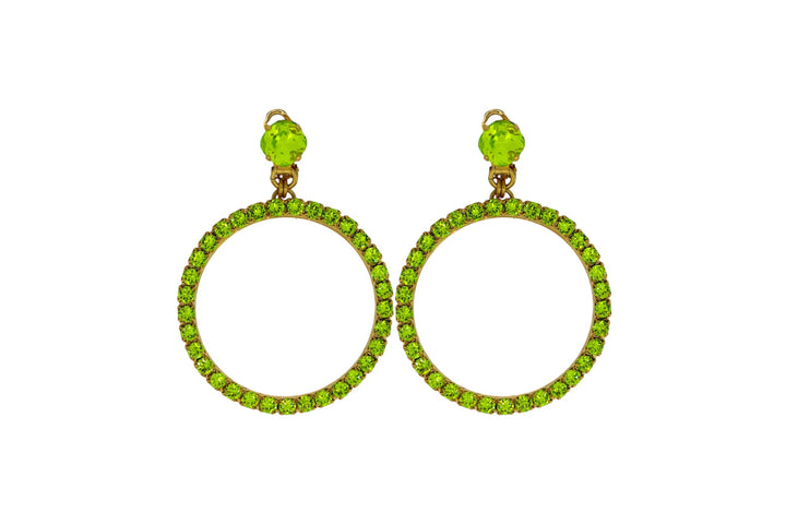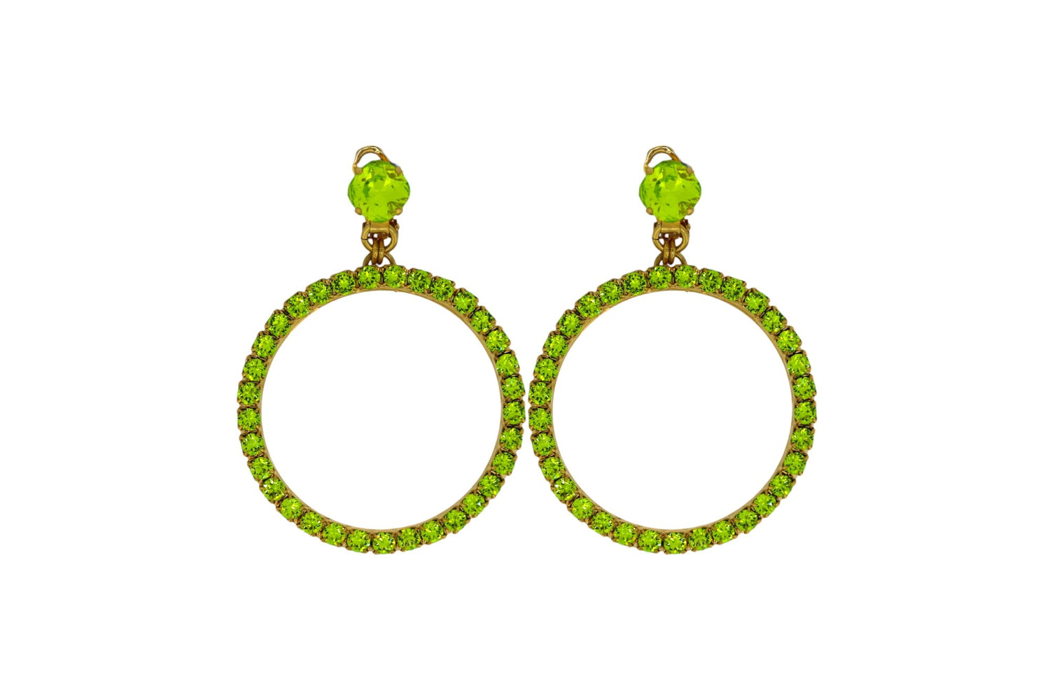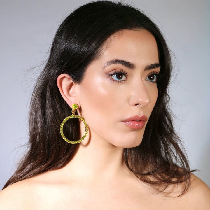 These Medium Green Hoop Earrings by Vickisarge are a scene-stealing essential that makes every day feel like a celebration. Inspired by the styles of Studio 54, these hoops are set with 33 premium Austrian crystals in a luxurious 23k gold plating. The brilliant green color and handcrafted quality ensure that they will be noticed, adding a touch of bold elegance to any look.