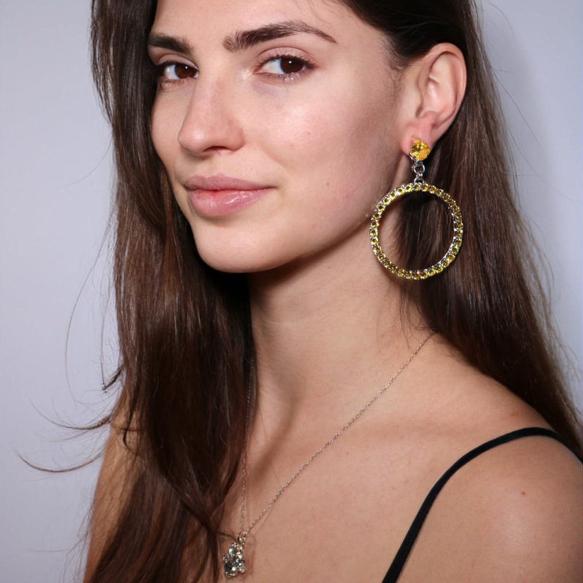 These Medium Yellow Hoop Earrings by Vickisarge are a joyful and captivating piece. Inspired by the styles of Studio 54, these hoops are set with 33 premium Austrian crystals in a luxurious platinum plating. The vibrant yellow color adds a burst of energy and optimism, making these earrings an essential accessory for any moment that calls for a little extra sparkle and celebration.