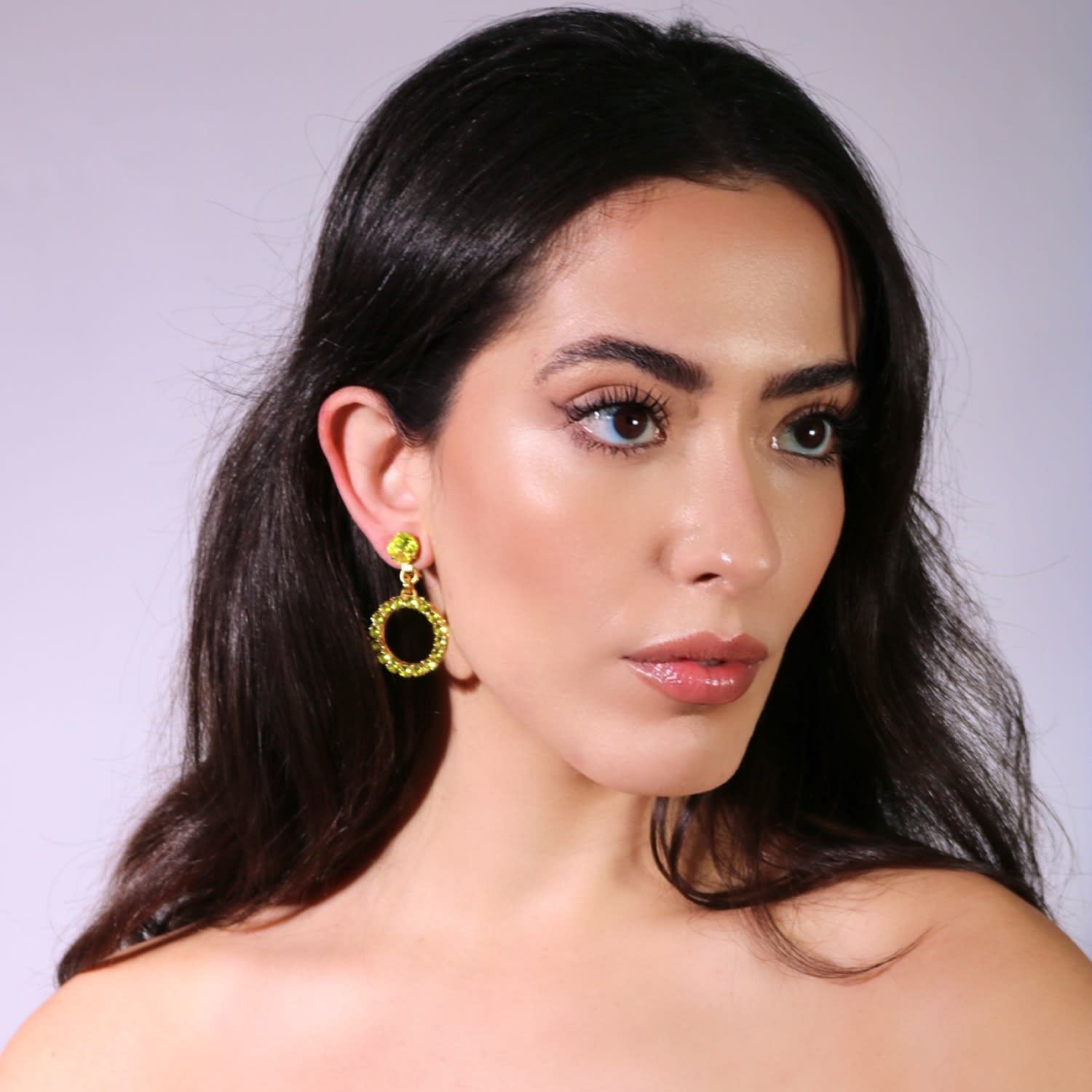 The Small Green Hoop Earrings by Vickisarge are a "scene stealing essential" inspired by the styles of Studio 54. Set with 16 premium Austrian crystals in a bright green hue, these hoops are handcrafted with luxurious 23k Gold plating. Despite their crystals, they are lightweight and comfortable, designed to add a touch of drama to any collection.