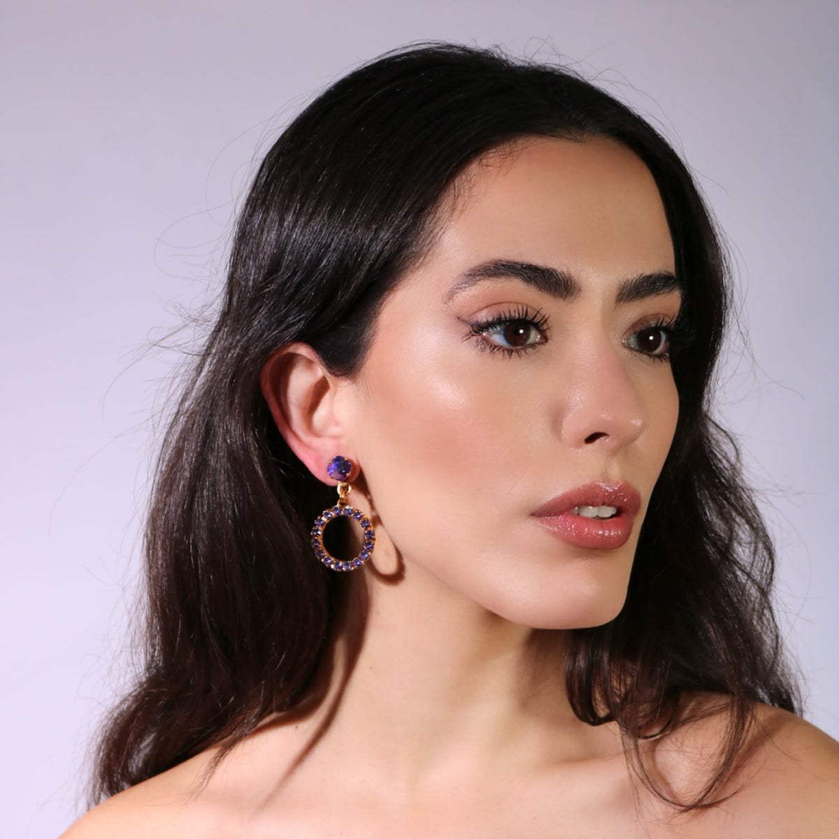 The Small Purple Hoop Earrings by Vickisarge are a "scene-stealing essential" inspired by the styles of Studio 54. Set with 16 premium Austrian crystals in a beautiful purple hue, these hoops are handcrafted with luxurious 23k Gold plating. Despite their crystals, they are lightweight and comfortable, designed to add drama to any look.