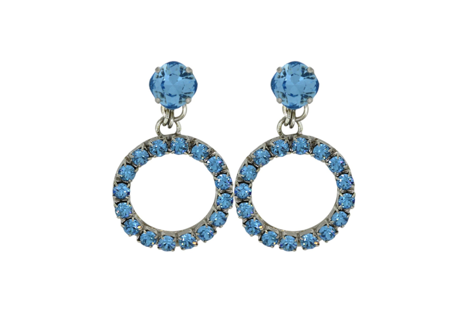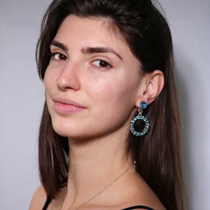 The Small Blue Hoop Earrings by Vickisarge are a "scene-stealing essential" inspired by Studio 54. They are set with 16 premium Austrian crystals in a vibrant blue hue and are handcrafted with luxurious Platinum plating. Lightweight and comfortable for extended wear, these hoops are sure to be noticed.