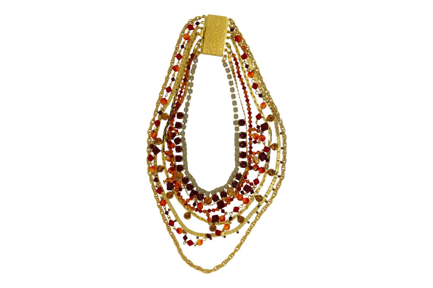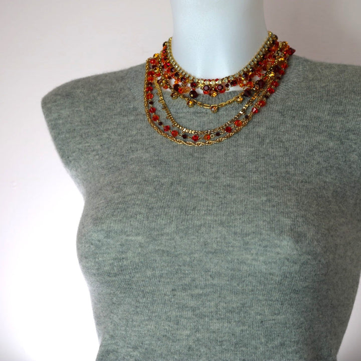 The Aurea Vita Necklace by Vickisarge is a one-of-a-kind statement piece. It features multiple strands of autumnal-toned crystal beads in warm, earthy hues, with 23k Gold-plated chains woven through the layers. The necklace is designed to evoke the beauty of falling leaves, combining natural inspiration with timeless sophistication.