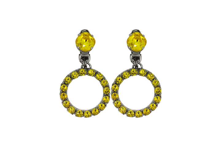 The Small Yellow Hoop Earrings by Vickisarge are a "scene stealing essential" inspired by the styles of Studio 54. Set with 16 premium Austrian crystals in a vibrant yellow hue, these hoops are handcrafted with luxurious Platinum plating. Despite their crystals, they are lightweight and comfortable for extended wear.