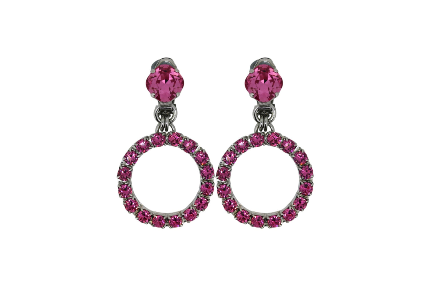 The Small Pink Hoop Earrings by Vickisarge are a "scene-stealing essential" inspired by Studio 54. Set with 16 premium Austrian crystals in a beautiful pink hue, these hoops are luxurious and handcrafted with Platinum plating. Despite their crystals, these earrings are lightweight and comfortable for extended wear.
