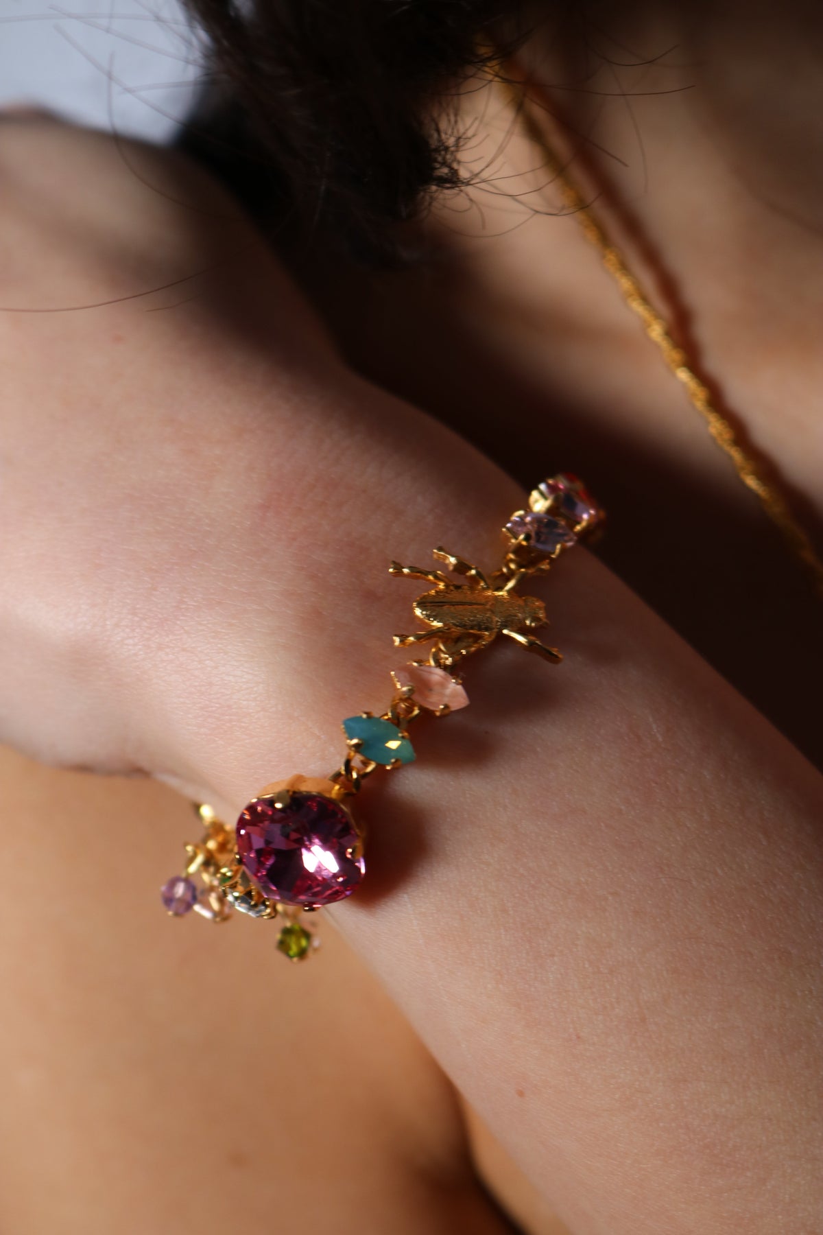 This Bouquet Bracelet by Vickisarge is a captivating piece that brings nature to life with luxurious details. It features a harmonious pattern of multicolored Premium Austrian Crystals that sparkle with every movement. Intricate bug motifs, finished in 23k gold plating, add a whimsical yet elegant touch. This bracelet is a bold and striking statement of creativity, artistry, and nature-inspired elegance.