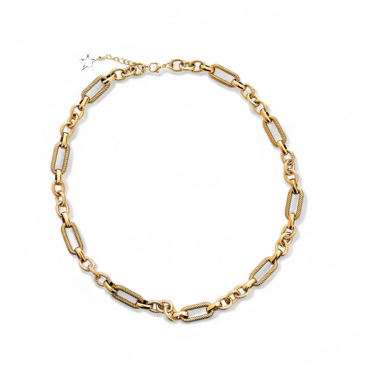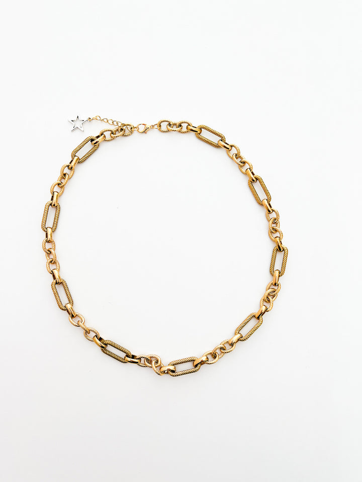 This Gold Metallic Alpheratz Necklace by Vicky&Nico is a versatile and chic chain necklace. It has a brushed gold finish and a unisex design, making it a perfect accessory for anyone looking to elevate their style with a touch of metallic shine. This necklace is also waterproof, anti-tarnish, and lightweight.