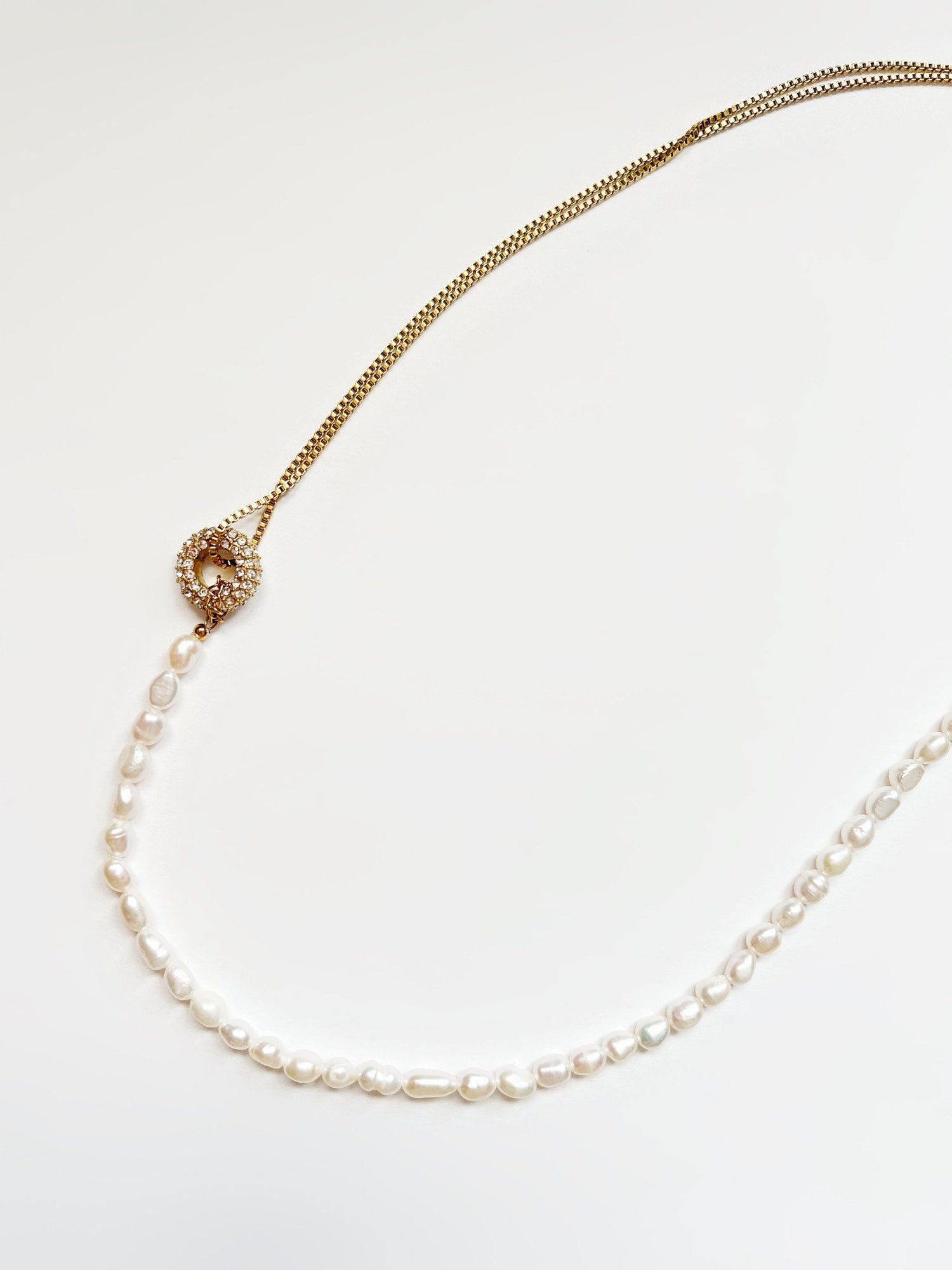 This pearl necklace features interlinked freshwater pearls. The sphere is made with cz and 18k Gold plating. The box chain is 18K Gold filled.