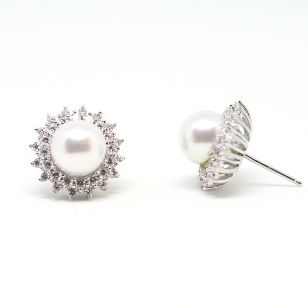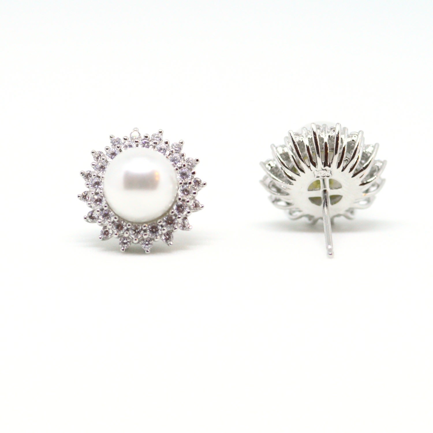 These stud earrings are handmade in the U.S.A. from 14k solid white gold. They feature a 9mm pearl and 100% natural diamonds (16 x 1.3mm and 16 x 1mm) with a VS1 clarity and G-H color. They are nickel-free.