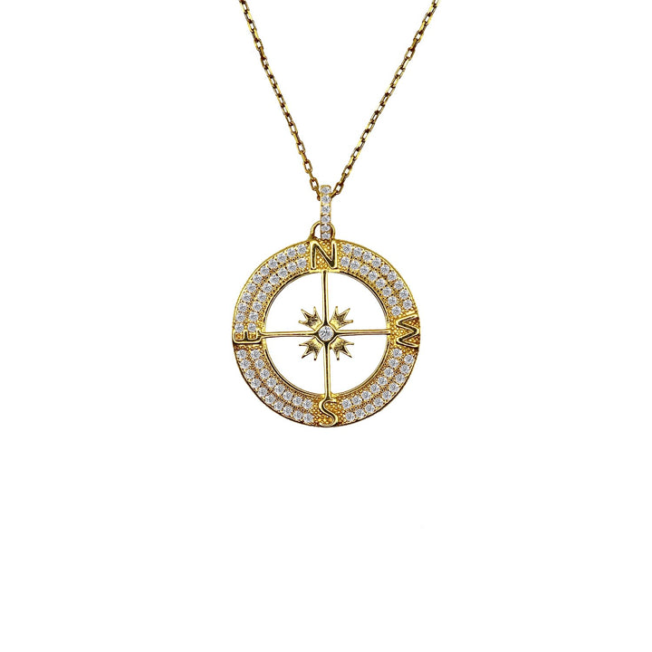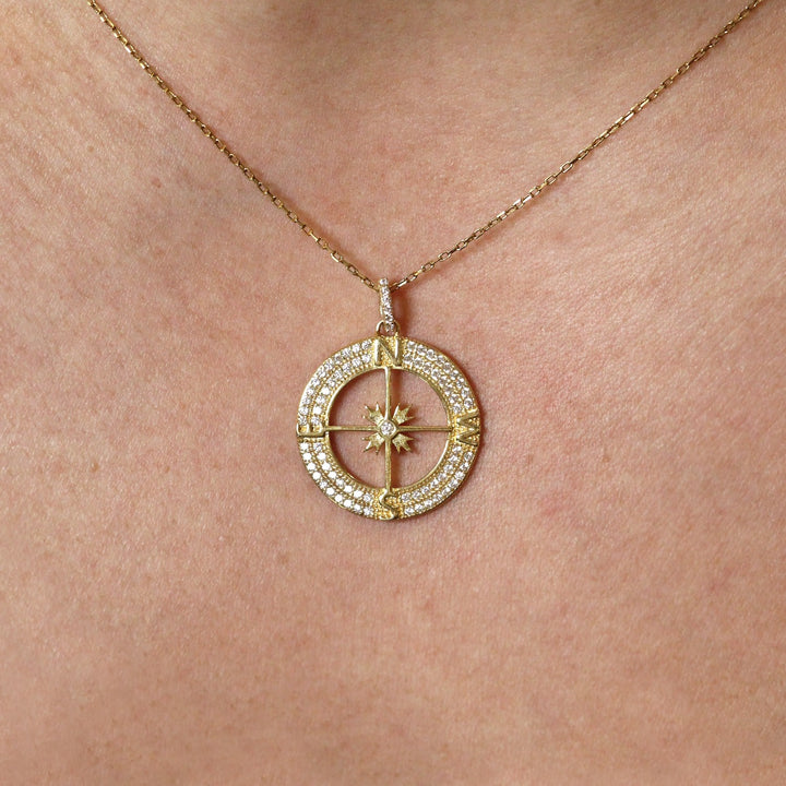 Crafted from 14-karat solid yellow gold, this necklace features a compass charm set with 100% natural diamonds (SI1/G Color). The pendant is approximately 1 inch in size and hangs on a 16-inch adjustable chain.