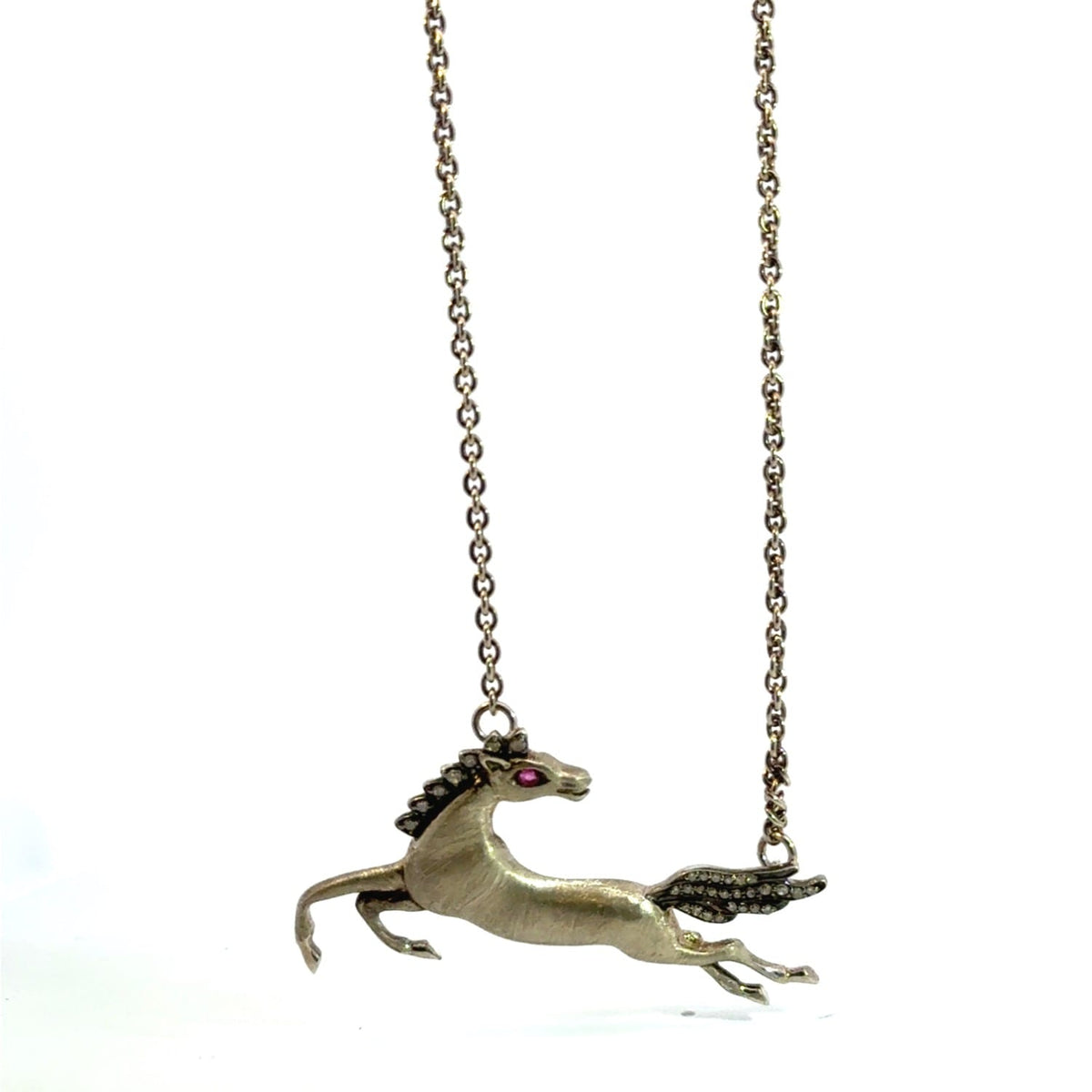 This necklace features a sterling silver chain, a horse charm with diamonds, and ruby eyes.