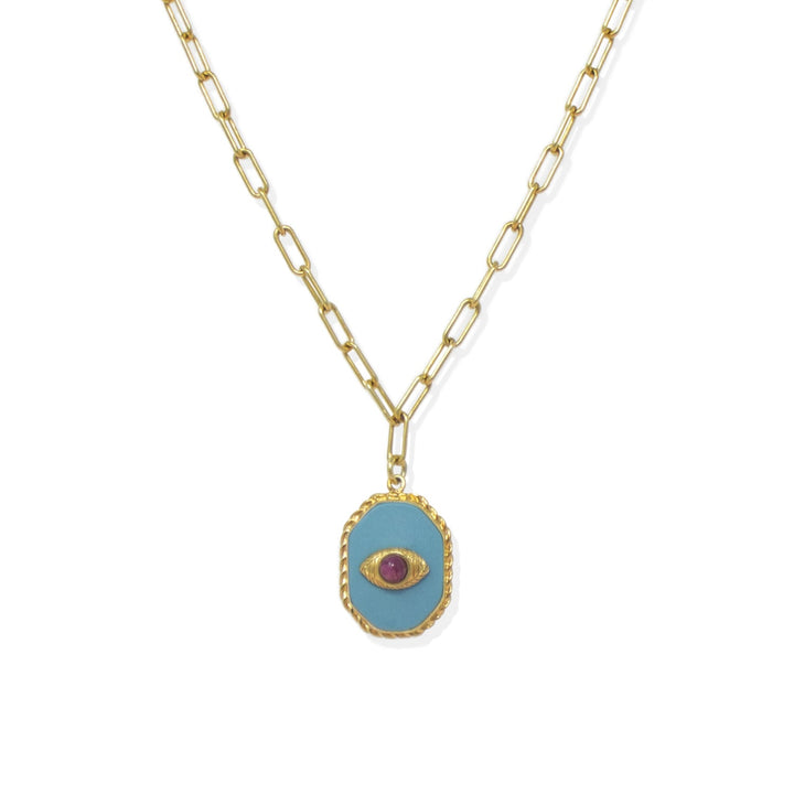 The Evil Eye Amulet Necklace With Ruby by Vintouch Italy is a beautiful and meaningful piece. This necklace features an Evil Eye amulet with a striking ruby nestled at the center of a turquoise jasperware stone, all framed in gold vermeil. This powerful talisman is believed to offer protection and good luck.
