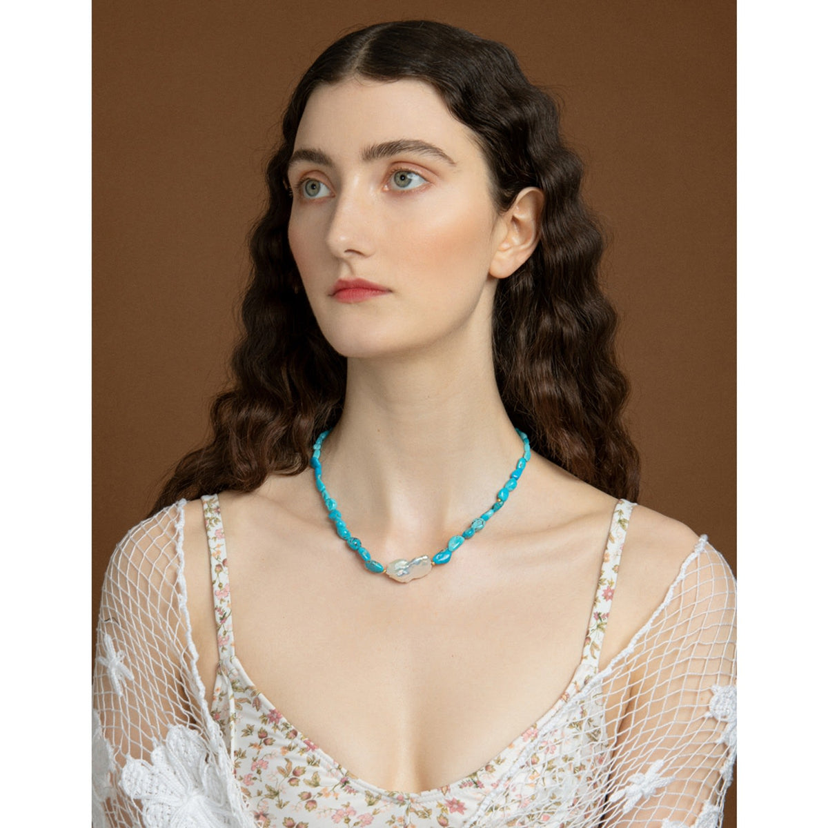 This Azzurra Turquoise & Pearl Necklace by Vintouch Italy is a beautiful and meaningful accessory. Handmade from vibrant natural turquoise and centered with a lustrous baroque pearl, the necklace symbolizes femininity. Its short drop makes it easy to layer with other delicate chains, making it a versatile and elegant piece.