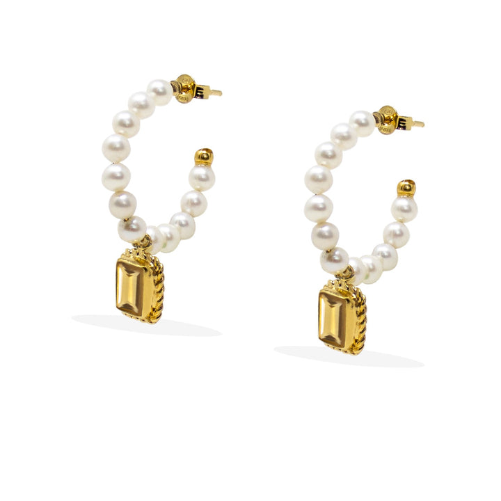 These hoop earrings are handcrafted from 18-karat gold vermeil and are set with natural yellow citrine and pearls. They are nickel-free.