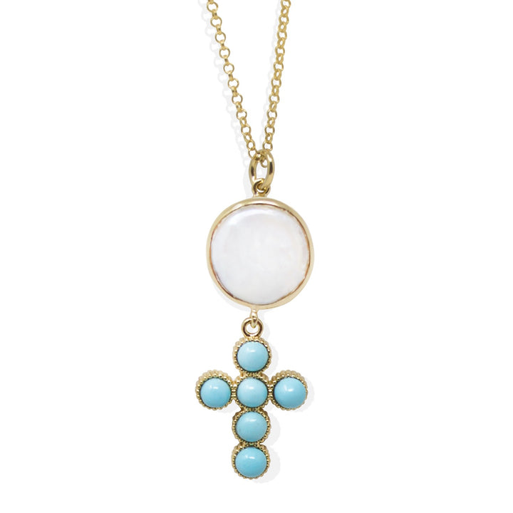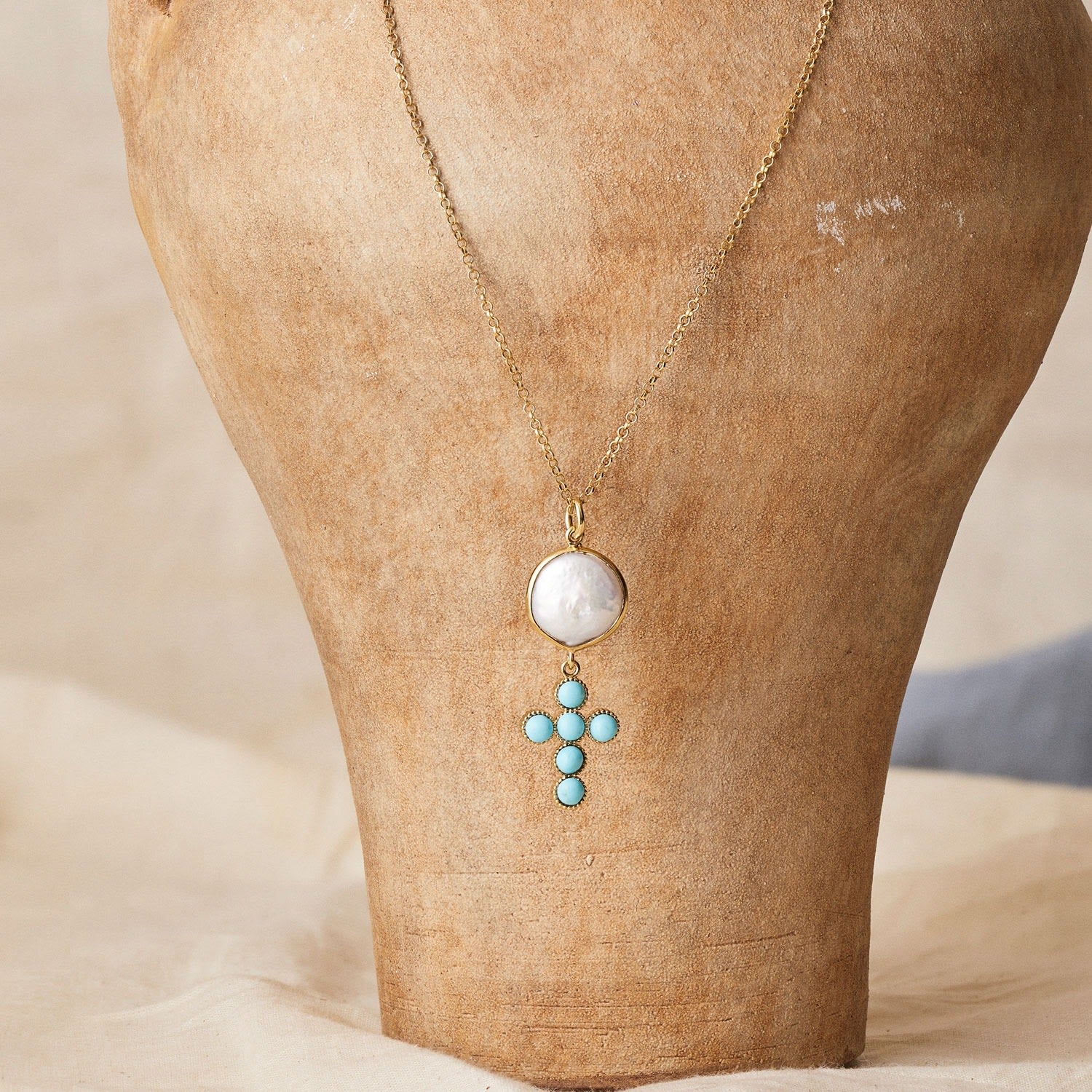 This necklace is cast from sterling silver with 18-karat gold plating (1 micron thickness). It is embellished with turquoise and a baroque pearl. It is nickel-free.