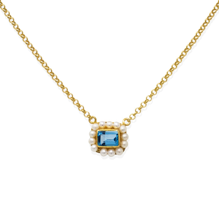 This necklace is crafted from 24-karat gold vermeil and is strung with a genuine sky blue topaz and pearls. The chain is adjustable and the piece is 100% handmade in Italy.