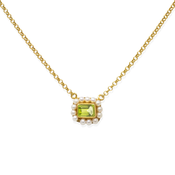 This necklace is made from 24-karat gold vermeil and is set with a natural peridot. It is Nickel-free and made in Italy.