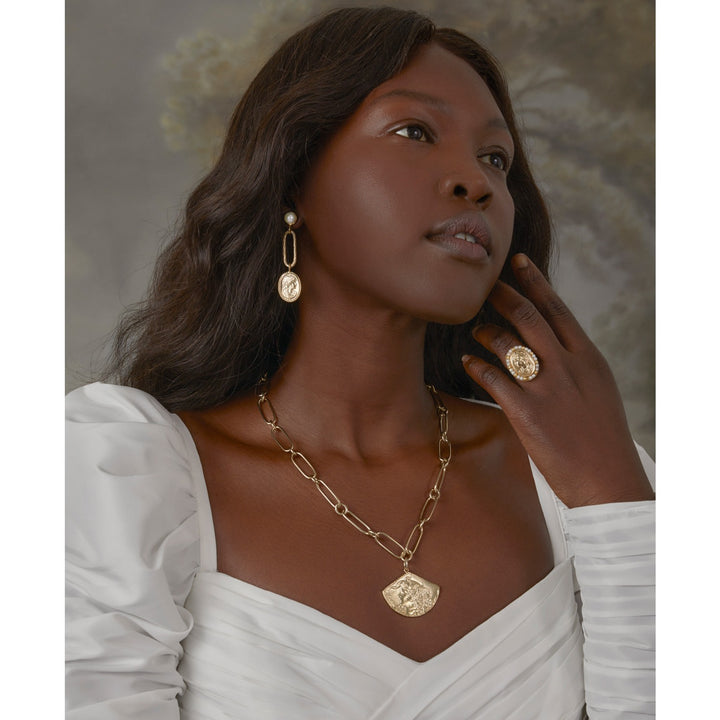 These Beatrice Gold-Plated Drop Earrings by Vintouch Italy are a luxurious and elegant accessory. Handcrafted in Naples, Italy, they feature lustrous freshwater Akoya pearls and coins that gracefully dangle, creating a timeless and sophisticated look. Made from recycled silver and plated with 18-karat gold, these earrings embody both beauty and a commitment to quality craftsmanship.