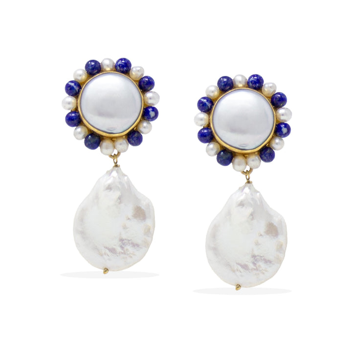 These drop earrings are handcrafted from 18-karat gold-plated silver (1.00 micron thickness). They are strung with freshwater pearls and lapis beads. An additional layer of palladium-plating is applied to protect the silver from tarnishing.