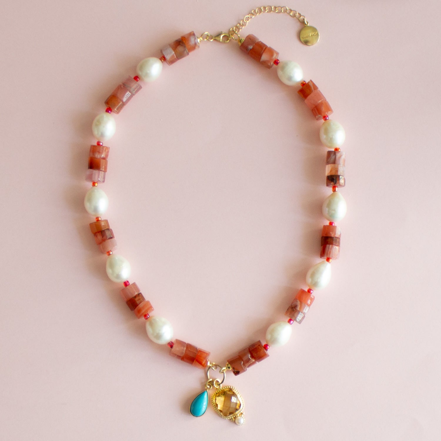 The Demetra Necklace by Vintouch Italy is a charming beaded necklace perfect for spring and summer. It blends natural orange quartz, shimmering pearls, vibrant citrine, and bright turquoise. Handmade in Italy, its lively colors and delicate design add a fresh, joyful touch to your seasonal wardrobe.