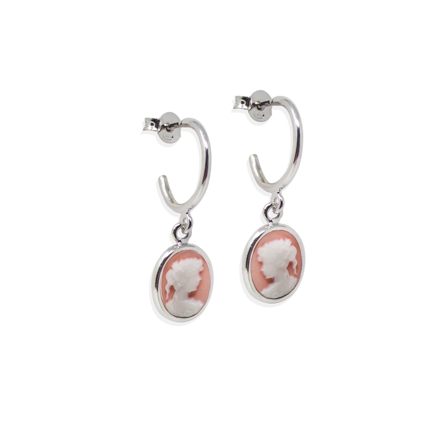 These hoop earrings are cast from 925 sterling silver and feature hand-carved cameos made from fine porcelain. They are nickel-free.
