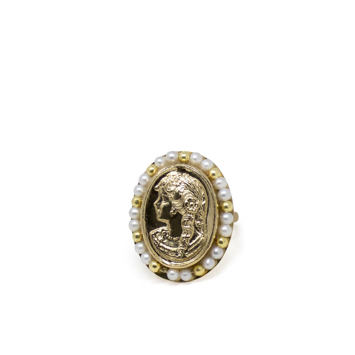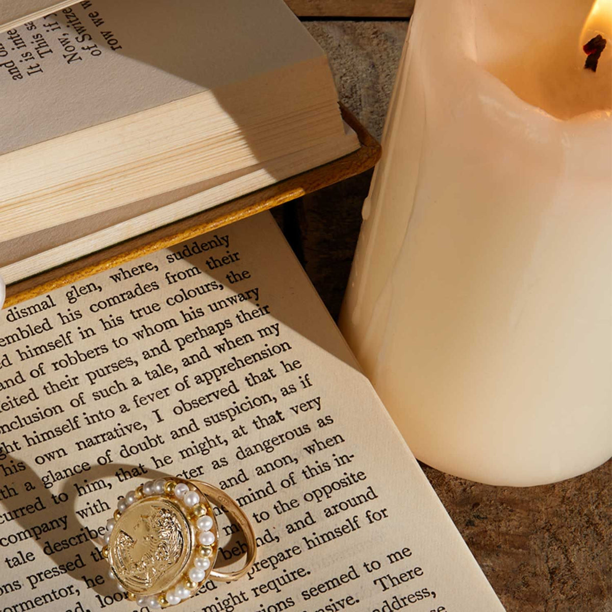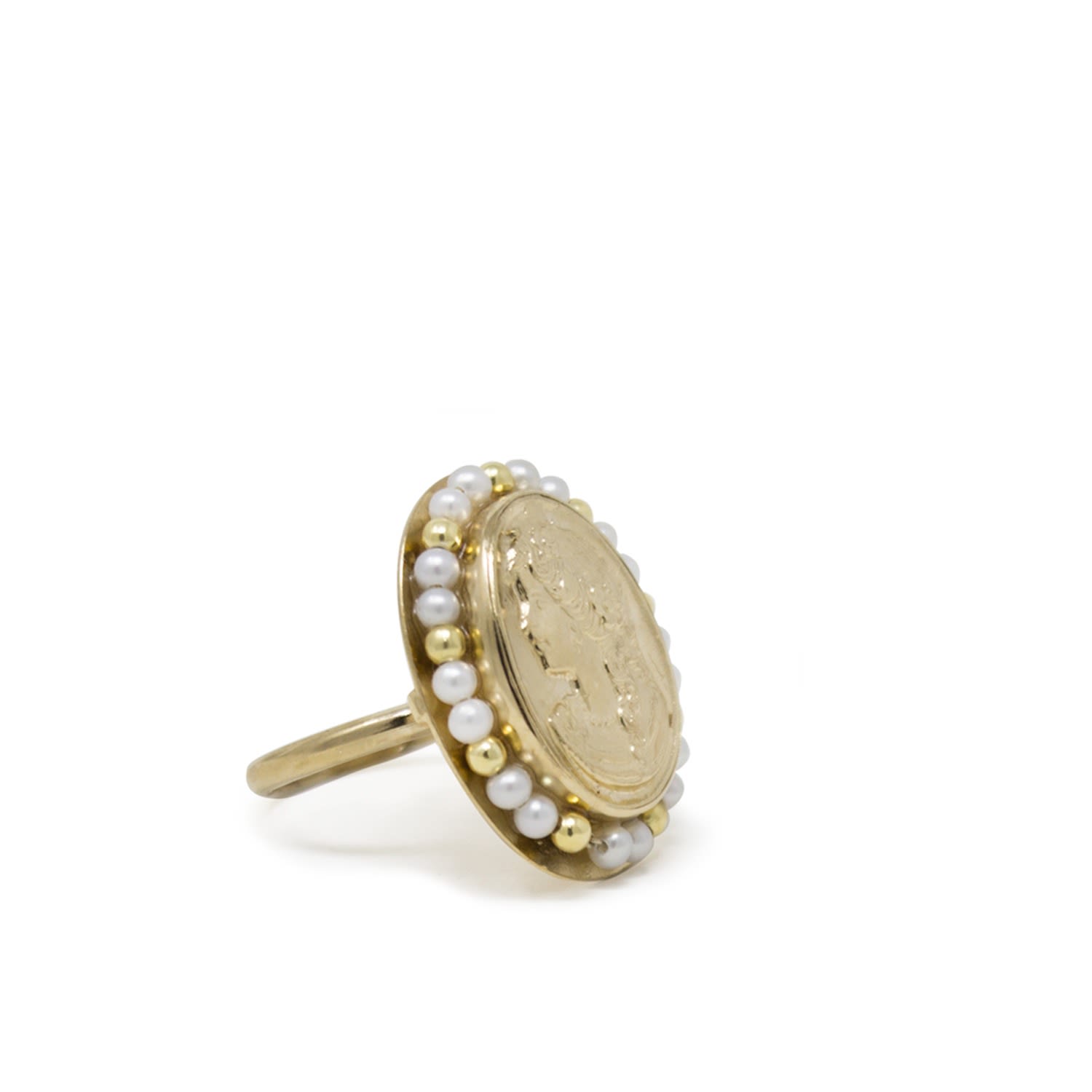 This Fiammetta Gold-Plated Pearl Ring by Vintouch Italy is an elegant and modern piece. Handmade from recycled 18-karat gold over sterling silver, the ring is embellished with dainty freshwater pearls that gracefully wrap around your finger. Its simple yet striking design makes it perfect for wearing alone for a major impact or stacking with other rings, symbolizing a blend of modern style and classic elegance.