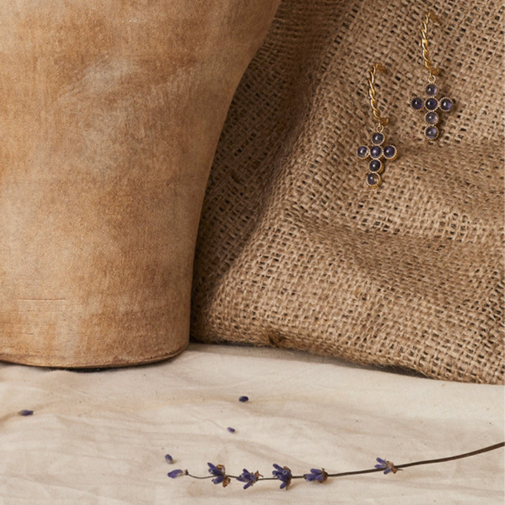 These Hope Gold-Plated Iolite Hoop Earrings by Vintouch Italy are a delicate and elegant accessory. The lightweight hoops are decorated with a dainty cross filled with sparklingly lively blue iolite stones, making them perfect for all-day wear. The design is both meaningful and beautiful, combining the classic hoop style with a touch of brilliant color.