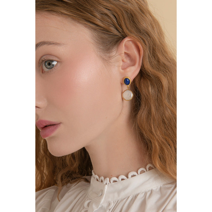 These earrings are handmade from 18k gold-plated sterling silver, featuring vibrant lapis lazuli and keshi pearls. The plating has a 1-micron thickness.