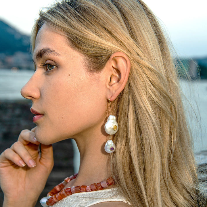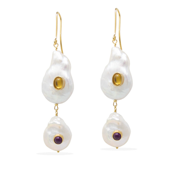 These earrings are crafted from 2.5-micron thick 24k gold vermeil over sterling silver, featuring a pair of baroque pearls, yellow citrine, and purple amethyst.