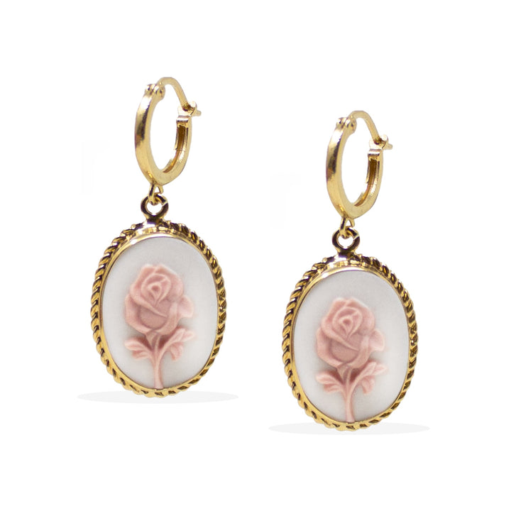 These Gold-Plated White Rose Cameo Hoop Earrings by Vintouch Italy are inspired by the timeless beauty of nature. Handmade from 18-karat gold-plated silver, these hoops feature hand-carved porcelain cameos depicting flowers, symbolizing rebirth and true love. They are a romantic and elegant accessory that adds a touch of classic artistry to a modern hoop design.