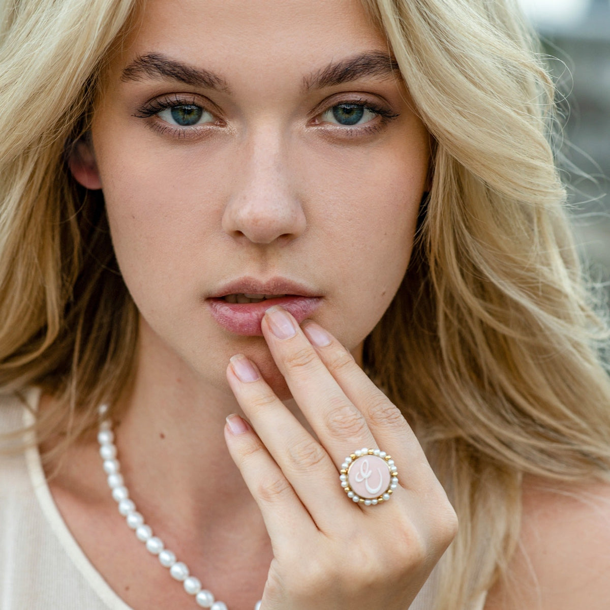 This Gold Vermeil Pink Cameo And Pearl Ring Initial E by Vintouch Italy is a unique and elegant piece with a personalized touch. Skillfully handcrafted in Italy, this ring features a delicate porcelain cameo of the initial "E" alongside lustrous pearls. The classic cameo design, combined with the modern flair of the gold vermeil setting and pearls, creates a statement piece that is both timeless and uniquely your own.