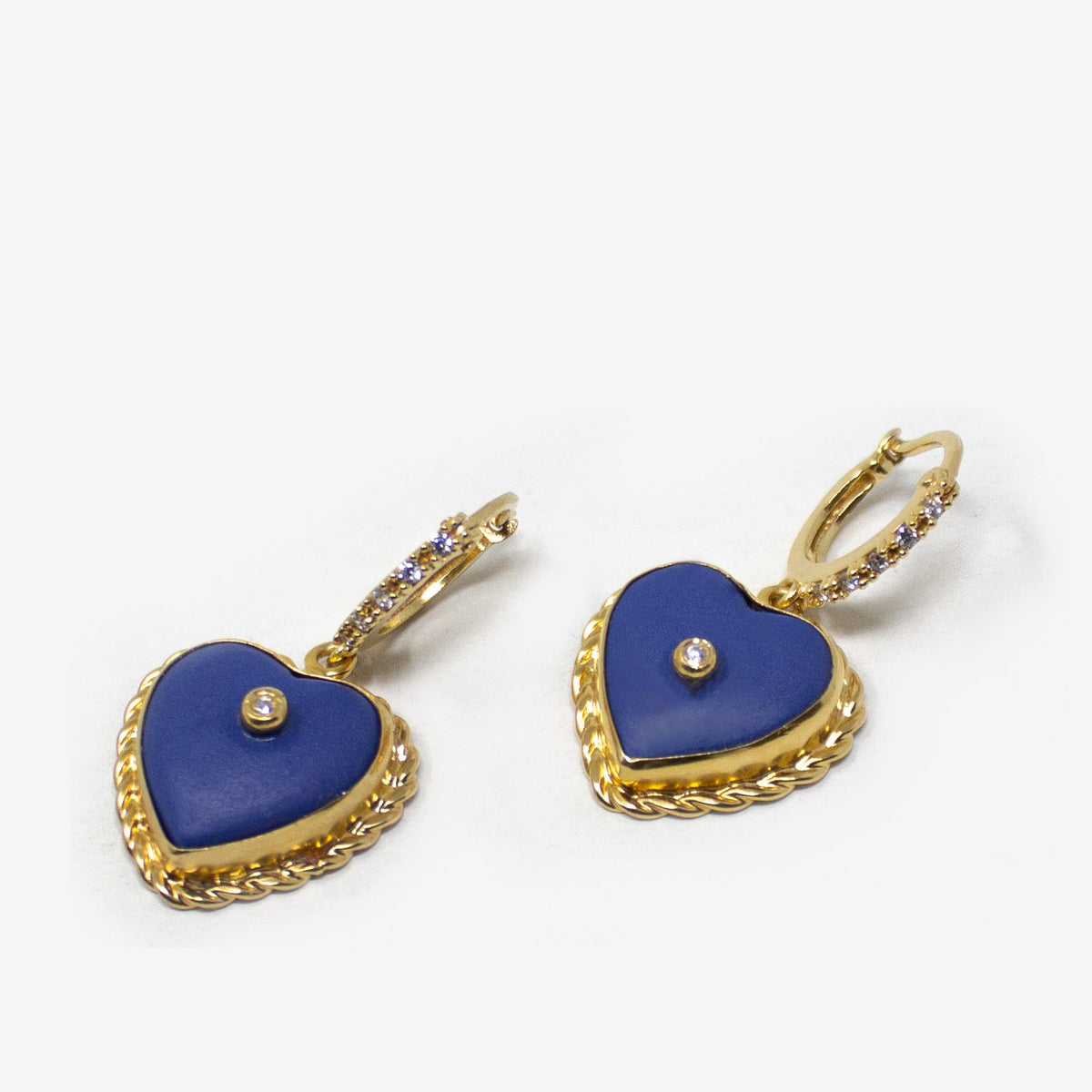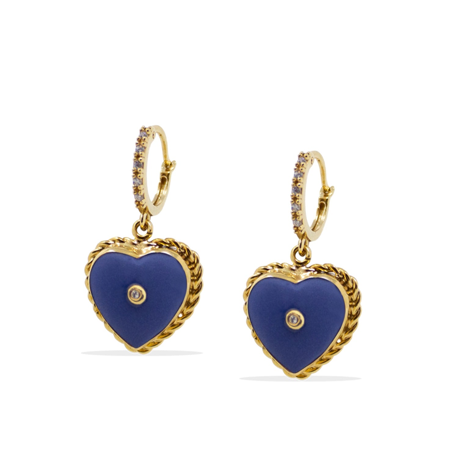 These Lovelight Gold-Plated Blue Heart Hoop Earrings by Vintouch Italy are elegant and romantic. Handmade in Italy, these hoops feature a beautiful blue heart charm enriched with sparkling laboratory-grown diamonds. They are a perfect piece to "light up your face," offering a stylish and versatile look that can be worn alone for a classic feel or stacked with other earrings for a more modern, playful style.