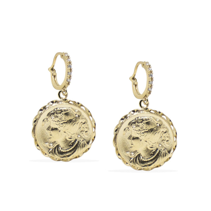 The Alexa Gold-Plated Hoop Earrings by Vintouch Italy are a celebration of femininity and timeless elegance. These earrings are handcrafted from 18-karat gold-plated recycled silver and feature drop pendants with delicate engravings of women's silhouettes, reminiscent of classic cameos. The hoops are traced with illuminating cubic zirconia, creating a radiant and sophisticated piece.