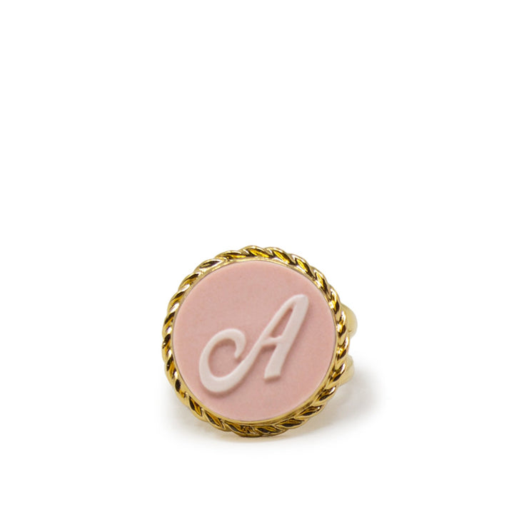 This Pink Cameo Ring with the initial "A" by Vintouch Italy is a perfect way to add a personal and luxurious touch to your look. Hand-carved from cameo and masterfully handset in 24-karat gold vermeil, this signet ring is a beautiful blend of classic artistry and modern design. It's a timeless piece that feels intimately yours and is designed for an elegant, everyday statement.