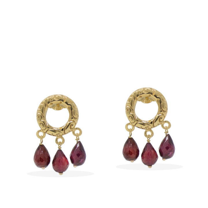 These stud earrings are handmade from 24-karat gold vermeil over sterling silver (2.5 microns) with an additional layer of palladium plating. They feature a dangling drop-shaped red garnet.