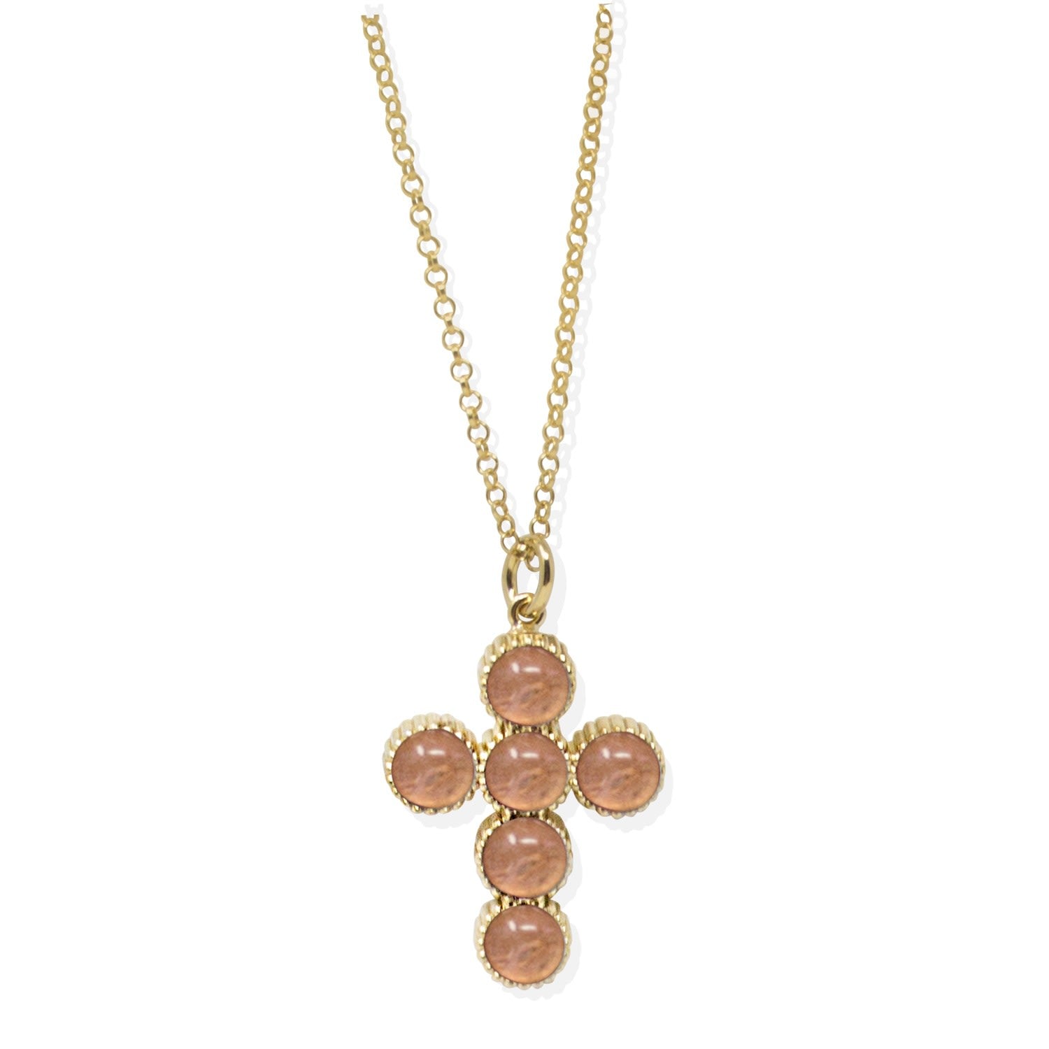 The Hope Gold-Plated Pink Tourmaline Necklace by Vintouch Italy is a colorful and positive pendant necklace. Handmade in Italy from 18-karat gold-plated silver, this necklace features a dainty cross pendant enhanced by delicate pink tourmalines. The palladium plate under the gold protects it from oxidation, ensuring its longevity.