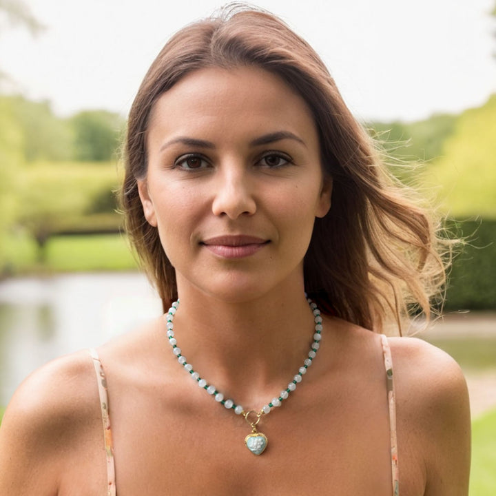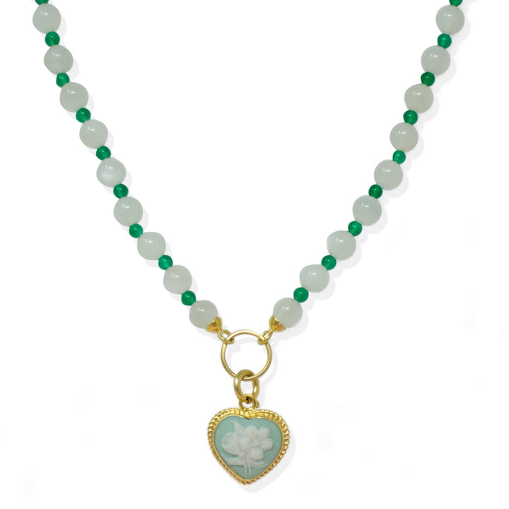This beaded necklace is cast from 24-karat gold-plated silver (2.5-micron thickness) with an additional layer of palladium-plating (0.1-micron thickness). It features moonstone and green agate beads and a hand-carved porcelain heart-shaped cameo. It is nickel-free.