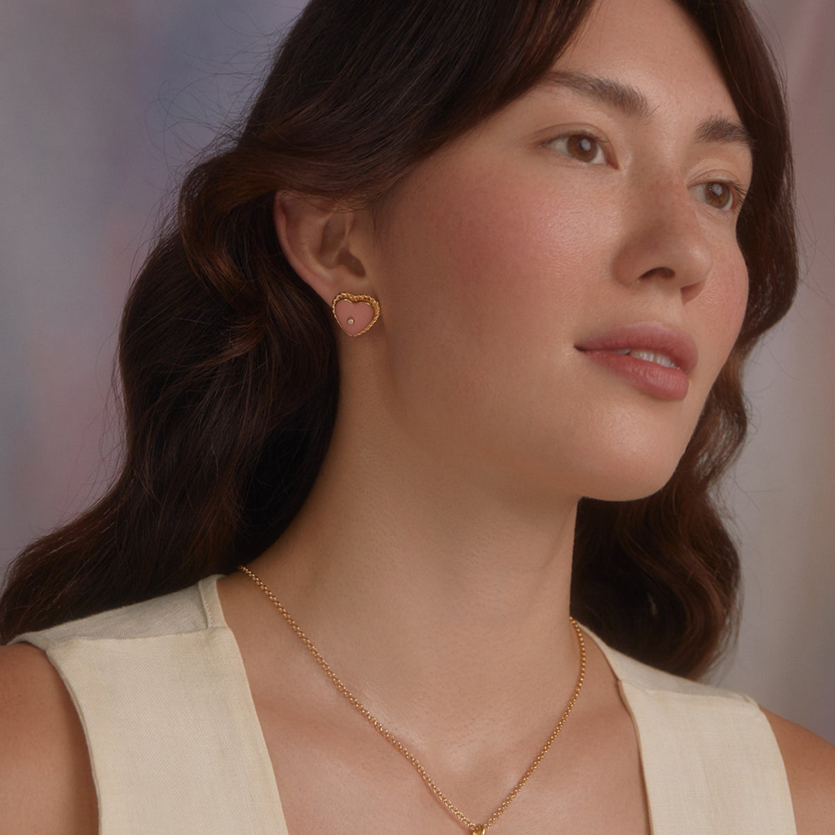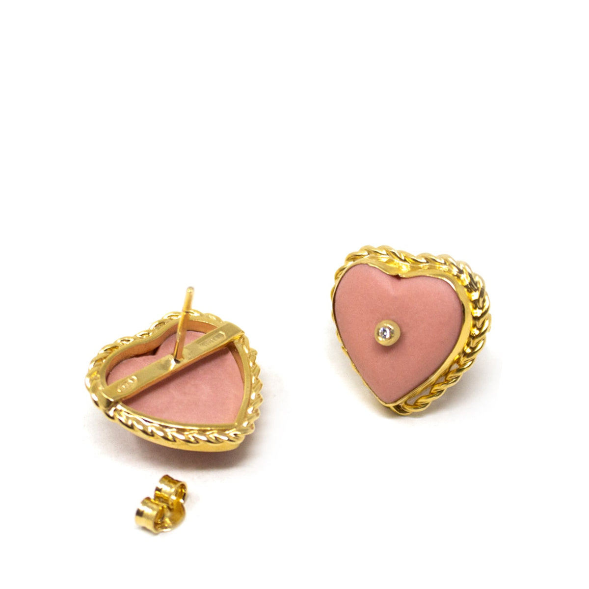 These stud earrings are handmade from 24k gold-plated silver (2.5-micron thickness) with a protective palladium layer. They feature pink porcelain hearts and a laboratory-grown diamond. They are nickel-free and handmade in Italy.