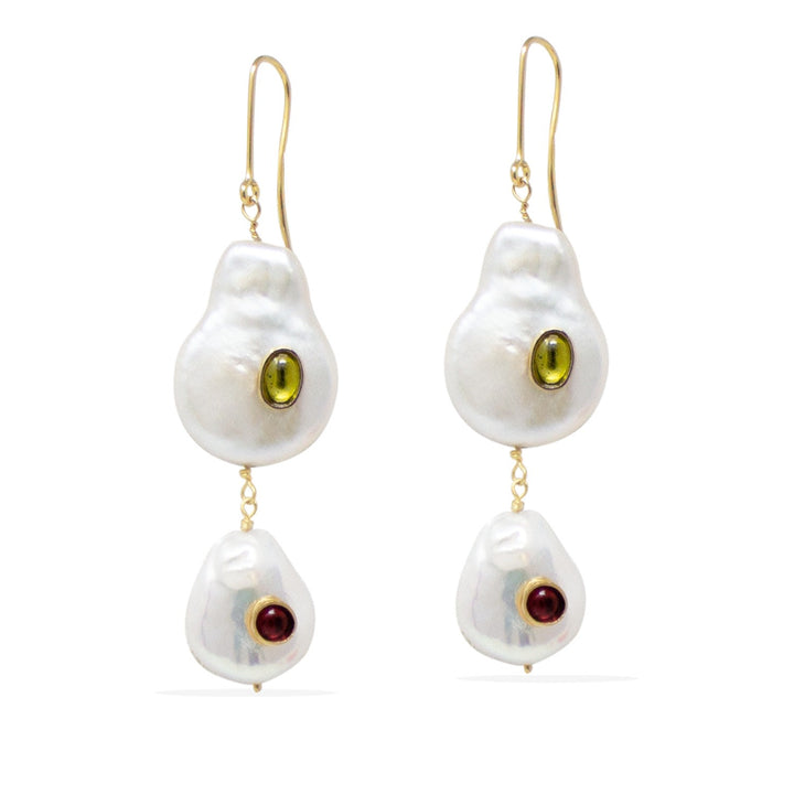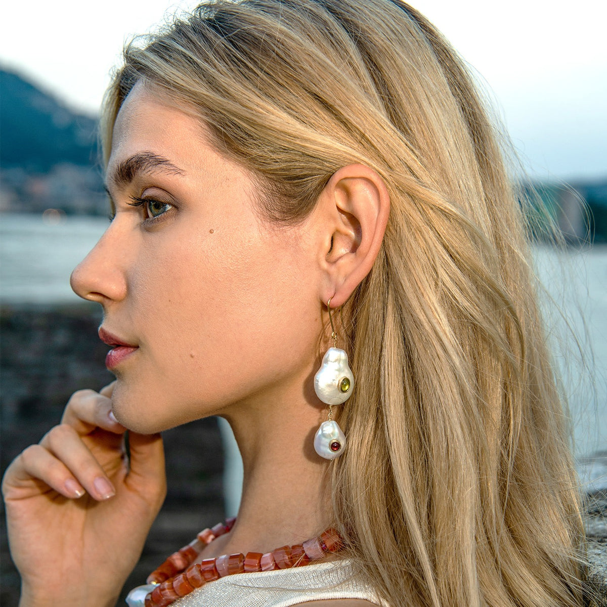 These earrings are crafted from 24k gold vermeil over sterling silver (2.5-micron thickness) with a protective palladium plate. They feature lustrous freshwater baroque pearls, green peridot, and red garnet. They are nickel-free and handmade in Italy.