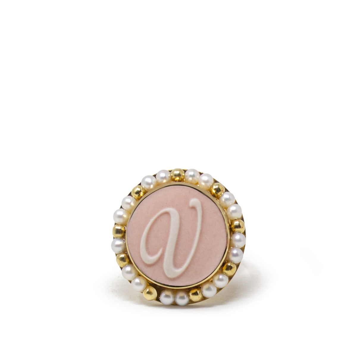 The Pink Initial V Cameo Ring With Pearls by Vintouch Italy is an elegant ring with a romantic and vintage feel. Handmade from 24-karat gold vermeil, it is inlaid with a hand-carved pink porcelain cameo and wrapped in an arrow of lustrous freshwater pearls. You can choose a specific initial for a personalized touch.