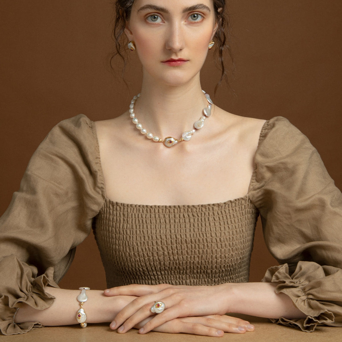 This The Eye Gold-Plated Ruby & Pearl Ring by Vintouch Italy is a masterfully handmade piece with powerful symbolism. The natural Akoya baroque pearl is complemented by a pink ruby "eye" that symbolizes protection, making it a perfect gift for someone starting a new chapter. With its combination of natural beauty and meaningful design, this ring is both unique and elegant.