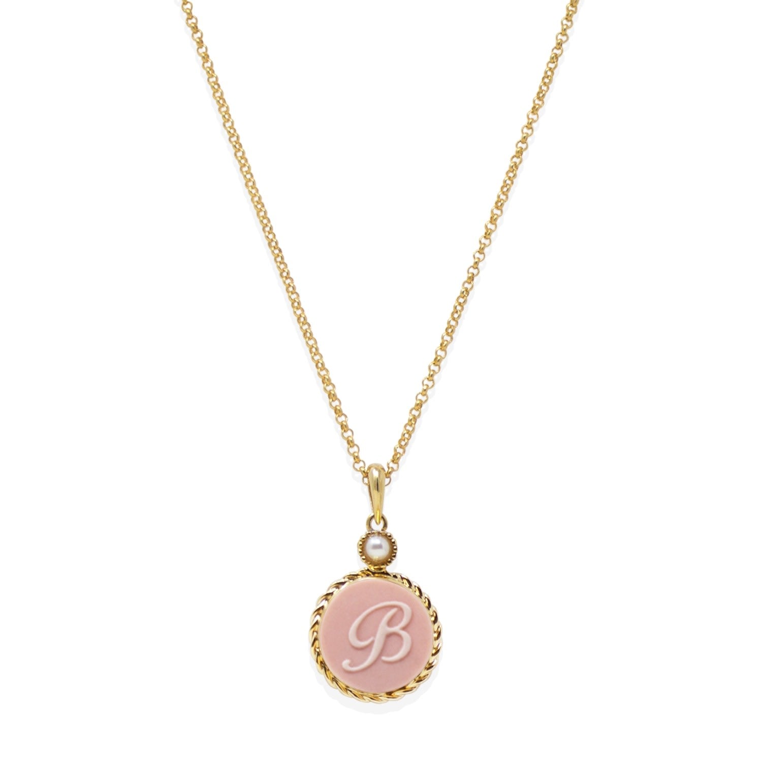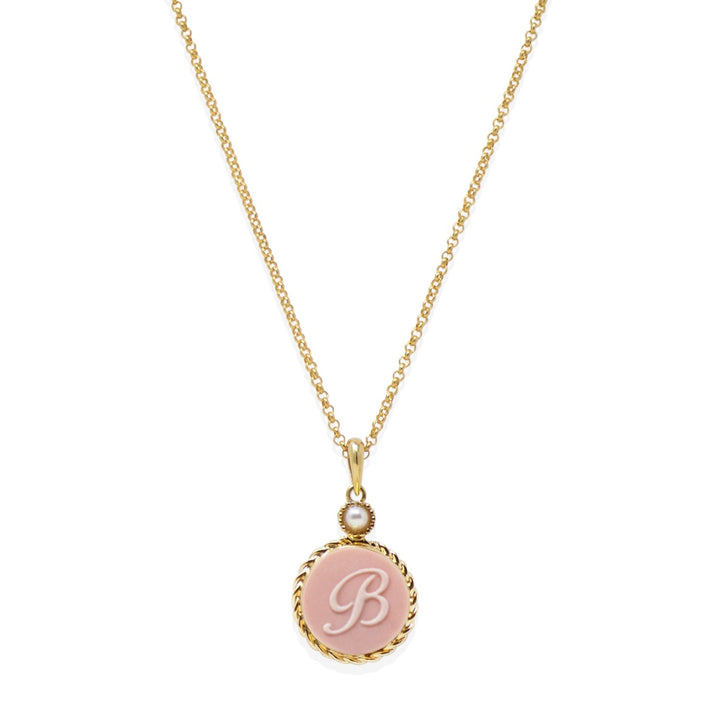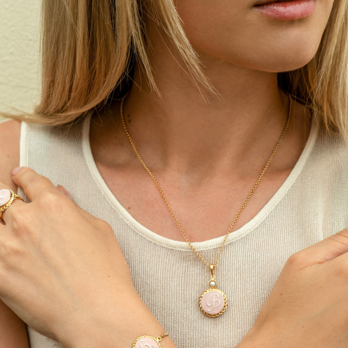 This Gold Vermeil Pink Cameo Initial Necklace by Vintouch Italy is an elegant and timeless piece that celebrates personalization. The hand-carved cameo, a symbol of classic artistry, is beautifully set in gold vermeil and accented with a delicate freshwater pearl, adding a touch of sophisticated charm. This necklace can be worn alone for a subtle impact or layered for a bolder look, offering a personal and luxurious statement.