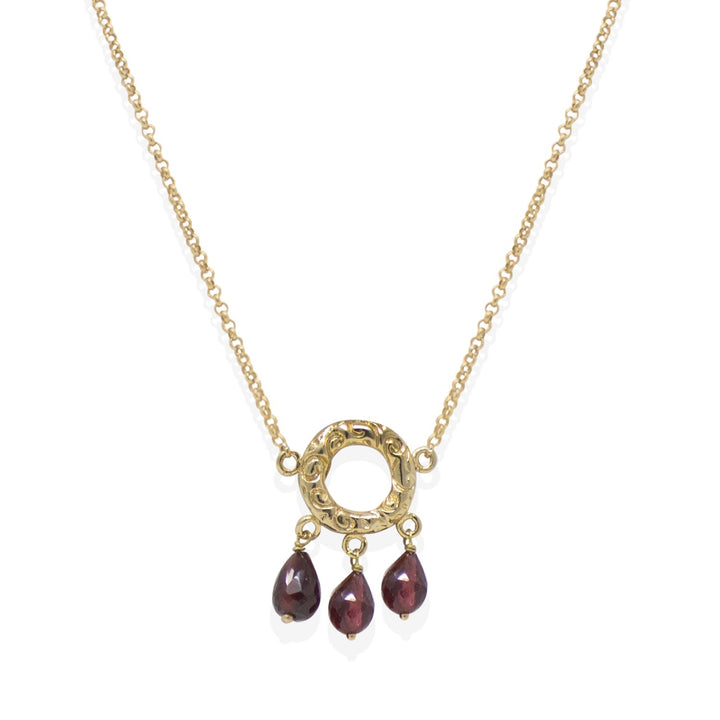 This necklace is handmade in Italy and cast from sterling silver plated with 24-karat gold vermeil (2.5 microns thick). It features drop-shaped red garnet gemstones.