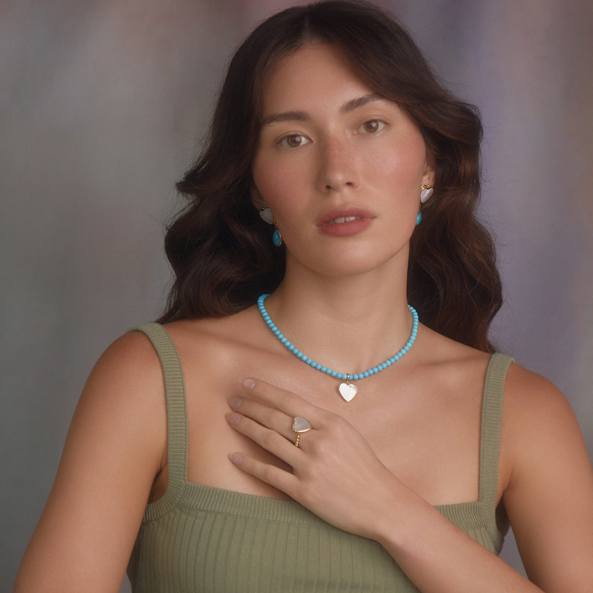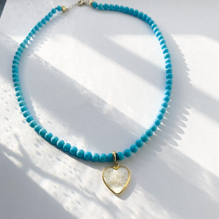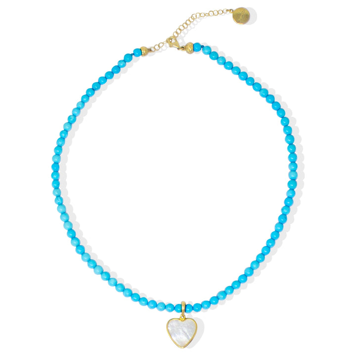 This necklace is handmade in Italy from 24-karat gold vermeil and strung with "Quattro fiori" turquoise beads and an iridescent mother of pearl heart pendant.