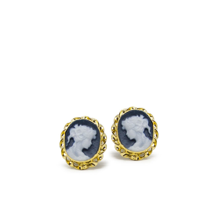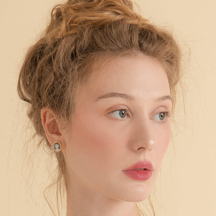 These Gold-Plated Black Mini Cameo Stud Earrings by Vintouch Italy offer a pop of colorful refinement for simple outfits. These studs feature hand-carved porcelain cameos, a traditional art form associated with love and romanticism. Their essential and versatile style makes them perfect for everyday wear, allowing you to carry a piece of history and art with you.